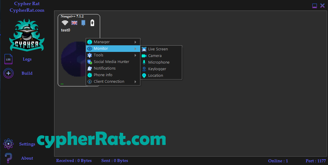 Cypher Rat : is An Android Remote Control Tool Allows You To Control And Monitor Android Phone From Your PC For More Information Please Join Our Telegram Channel